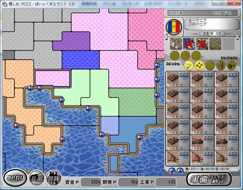 上陸作戦でもかなりの損害が予想される。 まったく活躍のなかった海上部隊は 制海権を握れないので基地に引き揚げるしかない。 イギリスのスコットランドを占領して、航空部隊で猛爆撃を加えるしか ドイツのとるべき道は無い。 Uボートの量産が始まれば少しは有利になるだろう。 パンターD型は来るべきソ連との戦いに備えるため東部の国境に向かわせる。 侵攻 フェロー諸島近海→スコットランド (イギリス攻略部隊) 空襲 イル・ド・フランス→南イングランド (BF110*3 He111H*3) 移動 フランス方面 フェロー諸島近海→北海 (ケーニヒスベルク、Z1級) 弾兵*2南ネーデルランド→ノルマンディ (Bf109E*2) イル・ド・フランス→ブルターニュ (BF110 Ju87C) イル・ド・フランス→アルデンヌ (擲弾兵*2) バルカン半島方面 スロベニア→クロアチア (4号戦車F2型、擲弾兵*2) エスターライヒ→スロベニア (4号戦車F2型、擲弾兵*2) ボヘミア→ポーゼン (パンターD型)