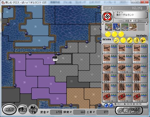 簡単にフランスが降伏してしまうので 少々、肩透かしを喰らった気分になる。 イル・ド・フランスでは イギリスとフランスが交戦している。 昨日の友は今日の敵。 フランスが降伏した。 将軍はメイドになったそうな・・・ 北ネーデルランドとハンザシュタットに イギリスのウェリントン1が爆撃にやってきた。 北ネーデルランド 擲弾兵*2 VS ウェリントン1 戦果 ウェリントン1(2) 損害 港(4) ハンザシュタット 擲弾兵*2 VS ウェリントン1 戦果 ウェリントン1(4) 損害 大工場(3) やはり北ネーデルランドとハンザシュタットに 対空部隊(88mm Flak18*3)を配備しないといけないようだ。 戦闘が終わると 4号戦車F2型の開発が終了した。