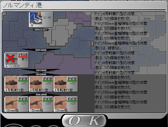 イベントが発生するので戦闘は起きないはずだ。 侵攻 アルデンヌとノルマンディーから イル・ド・フランスへ侵攻する。 アルデンヌ→イル・ド・フランス (3号戦車E型*3) ノルマンディー→イル・ド・フランス (3号戦車E型*4、4号戦車F1型*5、88mm Flak18*3、150mm砲*3) 空襲 反撃に備えてノルマンディーとアルデンヌを支援する。 南ネーデルラント→ノルマンディー (Bf109E*3 Ju87C*3) ラインラント→アルデンヌ(BF110F*3、He111H*3) 移動 後方の部隊を前線に送る。 南ネーデルラントの3号戦車E型*3、4号戦車F1型、88mm Flak18*3、150mm砲を ノルマンディーへ移動する。 ラインラントの4号戦車F1型、擲弾兵*2はアルデンヌへ移動する。 ユトランドの復興が終わったので擲弾兵*2はハンザシュタットへ移動する。