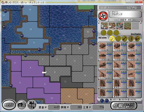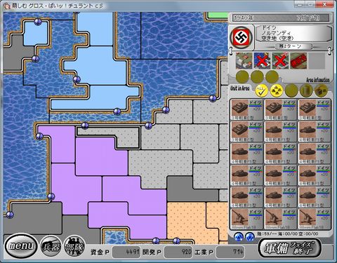 エリアの表示ができなくなった。 うかつに古いセーブデータは 削除できないようだ。 一体何が起きたのか・・・。 ターンを進ませる事はできるので押してみる。 2回の侵攻を阻んでいたル・ファンタスクを遂に撃沈する。 地上部隊はB1bis重戦車 D2中戦車の2部隊しかいなかった。 Bf109E*3 Ju87C*3 VS ル・ファンタスク 戦果 ル・ファンタスク 小破 損害 Ju87C(1) He111H*2 VS ル・ファンタスク 戦果 港(5) 損害 無し 4号戦車F1型*3 150mm砲*3 VS B1bis重戦車 D2中戦車 戦果 B1bis重戦車 D2中戦車 港(10) 損害 無し 4号戦車F1型*3 150mm砲*3 VS ル・ファンタスク 戦果 ル・ファンタスク 港 損害 無し 遂にノルマンディーを占領を占領したが 正常にプレイを継続できない。