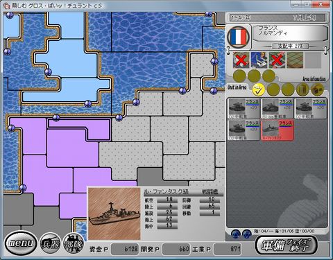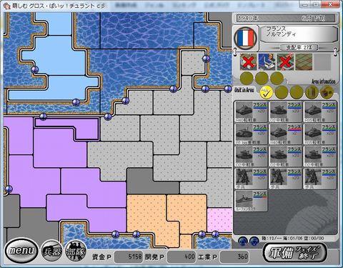 移動 まず前線の守りを固める。 南ネーデルラント→アルデンヌ (3号戦車E型*3、88mm Flak18*2) アルデンヌ→南ネーデルラント (4号戦車F1型*3、150mm砲*2) それから後方の部隊を前線に送る。 ハンザシュタットの88mm Flak18*3、150mm砲は北ネーデルラントへ 北ネーデルラントの88mm Flak18*3は南ネーデルラントへ ラインラントの4号戦車F1型と擲弾兵*2は南ネーデルラントへ 移動する。 ラインラントのBf109E*3とJu87C*3は南ネーデルラントへ ブランデンブルクのBF110*3、He111HとバイエルンのHe111Hは ラインラントへ移動する。 |