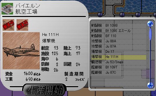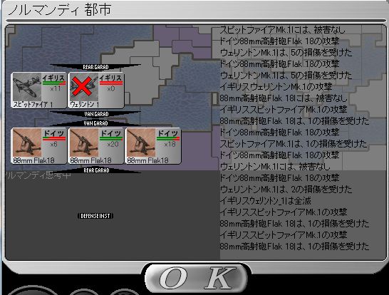3部隊しかいない88mm Flak18*3で迎え撃つ事にする。 1部隊が20の損害を受けて壊滅する。 88mm Flak18*3 VS スピットファイヤ1、ウェリントン1 戦果 スピットファイヤ1(9)、ウェリントン1 損害 88mm Flak18(14)、88mm Flak18(2) 88mm Flak18*3 VS MB.151C1 戦果 MB.151C1(11) 損害 88mm Flak18(1)、88mm Flak18(5) 88mm Flak18*3 VS ウェリントン1 戦果 ウェリントン1(9) 損害 88mm Flak18(5)、88mm Flak18(11) 陸上部隊の攻撃になったが、敵の陸上部隊がたったの2部隊しかいない。 残りはイル・ド・フランスに移動したらしい。 4号戦車D型*3 150mm砲*3 VS 25Ib野砲、105㎜榴弾砲 戦果 25b野砲、105㎜榴弾砲、都市(19) 損害 4号戦車D型(1) 以後、敵の陸上部隊がいないので、施設への攻撃が続いたが港を攻撃すると ル・ファンタスクがいて邪魔をするので、港に損害を与える事ができなかった。